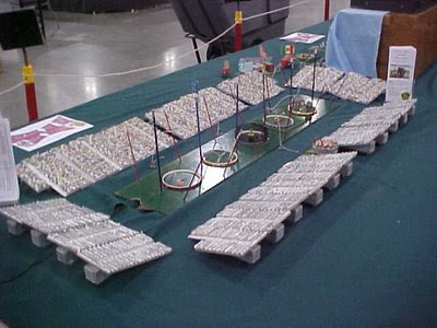 another note on each of the stantions we put a plackard discribing the display and also one tells of what products we used to create it the plackards are held by drilling a hole in the end of the stantion putting in a piece of copper pipe with a fourty five degree angle in it and attaching a 8x10 piece of plywood with a acrllic protecter on the face